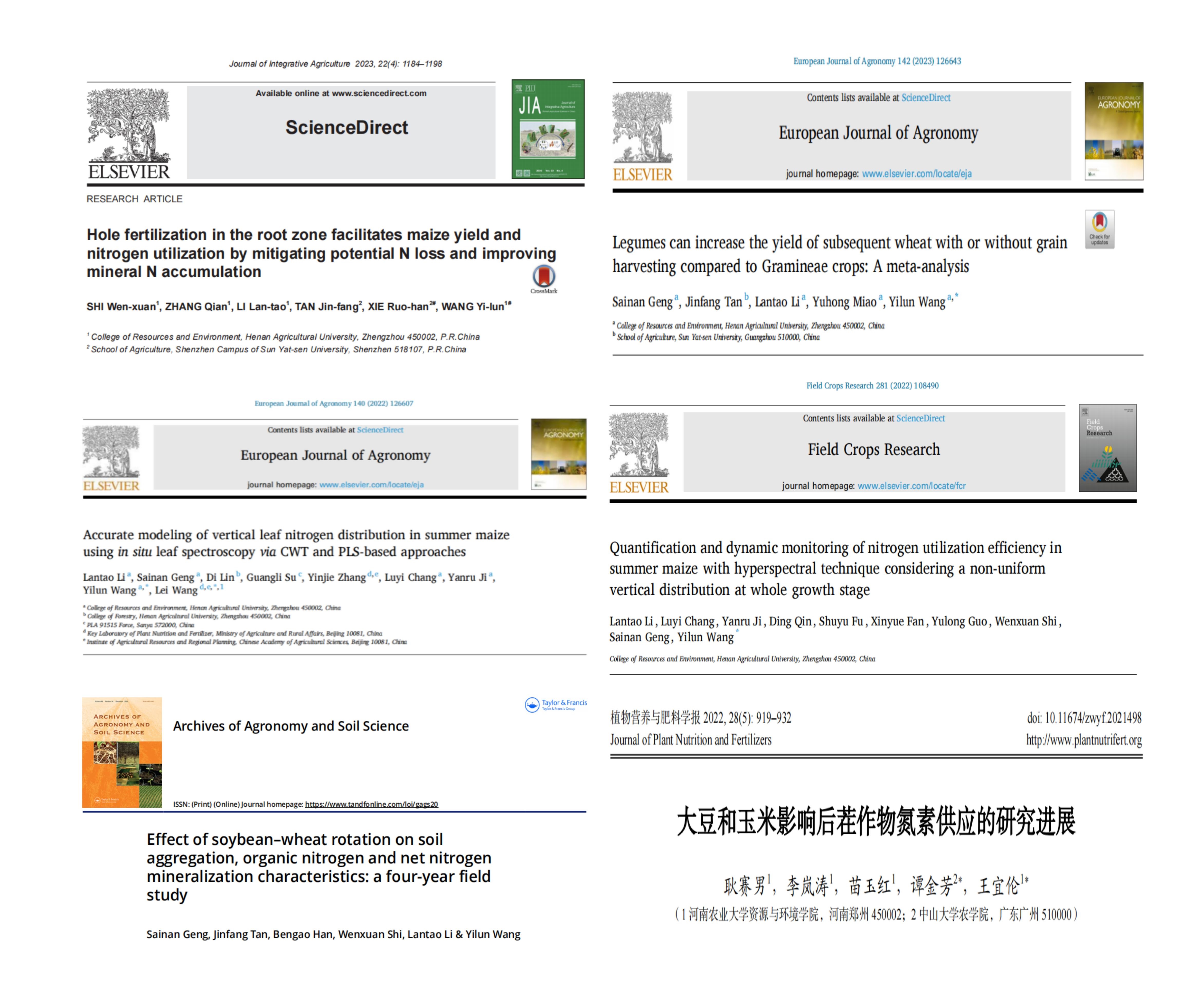 王宜伦教授领衔的“作物营养与高效施肥科技创新团队”在夏玉米根区一次性施肥、玉麦/豆麦周年轮作模式对土壤氮素转化特性与内在机制及夏玉米氮营养高光谱精确诊断方面取得系列新进展,相关研究成果先后发表在Journal of Integrative Agriculture (2023)、European Journal of Agronomy (2022; 2023)、Field Crops Research (2022)、Archives of Agronomy and Soil Science (2022)和植物营养与肥料学报(2022)等国内外专业领域代表性期刊。