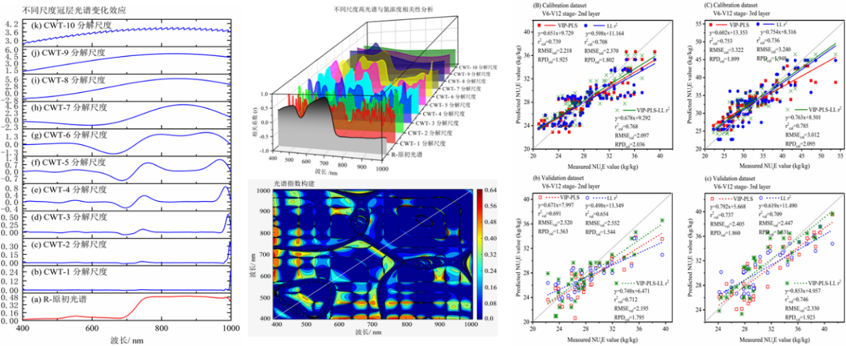 夏玉米作为一种生育期短、氮“稀释效应”显著且响应敏感的作物,使得基于高光谱的氮营养垂直分布监测同时受氮营养和生育期双因子联动变化影响,所构建反演模型很难应用于不同生长阶段并做到对氮素的稳定响应。本团队系统研究了高光谱经连续小波变(CWT)换后采用偏最小二乘回归(PLS)的全波段分析方法动态监测叶片氮浓度(LNC)和NUtE垂直分布的准确性和适用性。夏玉米LNC和NUtE冠层空间分布具有典型的垂向异质性变化规律,即上层最低,下层最高,且中下层LNC与NUtE为冠层高光谱技术实时和定量监测的有效和关键叶层;CWT变换光谱可显著提高夏玉米全生育期不同叶层LNC和NUtE冠层高光谱预测精度。研究结果将为夏玉米氮素营养实时监测和高产高效氮素管理提供理论依据。