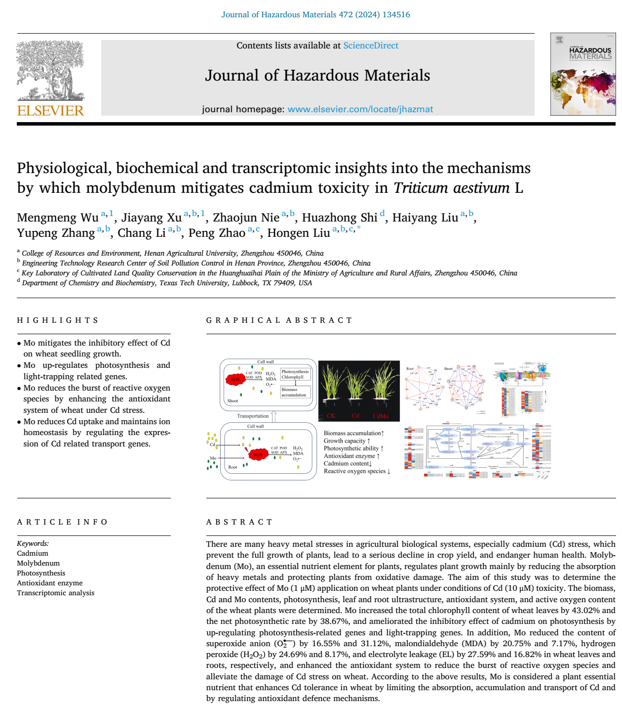 本研究是课题组在微量元素缓解小麦镉毒害方面取得的最新进展。暗网禁区 2022级硕士研究生吴孟孟和许嘉阳副教授为论文共同第一作者,刘红恩教授为通讯作者。暗网禁区 赵鹏教授、聂兆君副教授、李畅副教授、刘亥扬博士和张玉鹏博士为该项工作做出了重要贡献。美国德克萨斯理工大学施华中教授对论文内容进行了具体指导。该研究得到“十四五”国家重点研发项目(2021YFD1700900)、河南省土壤污染防治专项(HNNH-2023-001)、河南省高校重点研究项目基础研究项目(19zx007)和河南省自然科学基金(222300420464)等项目的资助。