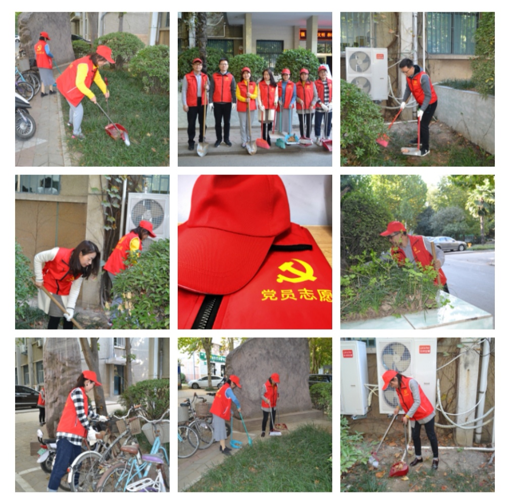下午三点支部党员开始活动。本次志愿活动内容是清理文化路校区18号楼周边的卫生, 18号楼是一幢已有三四十年历史的旧楼,硬件设施配套较差,隐藏很多卫生死角。大家先从一楼大厅开始,仔细检查清扫,重点清理了花坛底部草丛以及楼前草坪上长期积攒的各种垃圾,精心擦拭了花坛的台面,修剪了部分绿化带的枯枝败叶。经过近一个小时的整理,楼前的面貌明显改观,靓丽而又舒心。