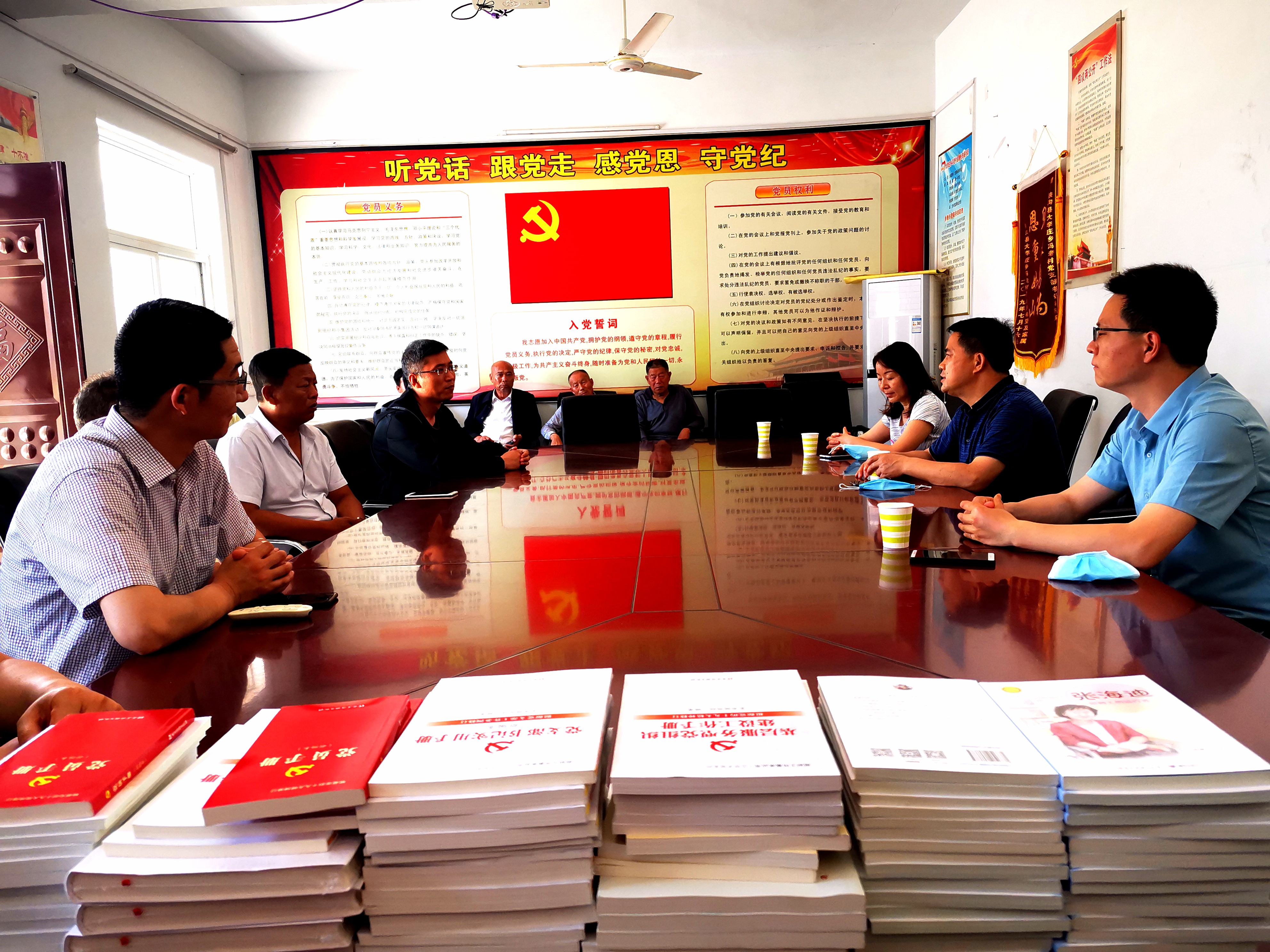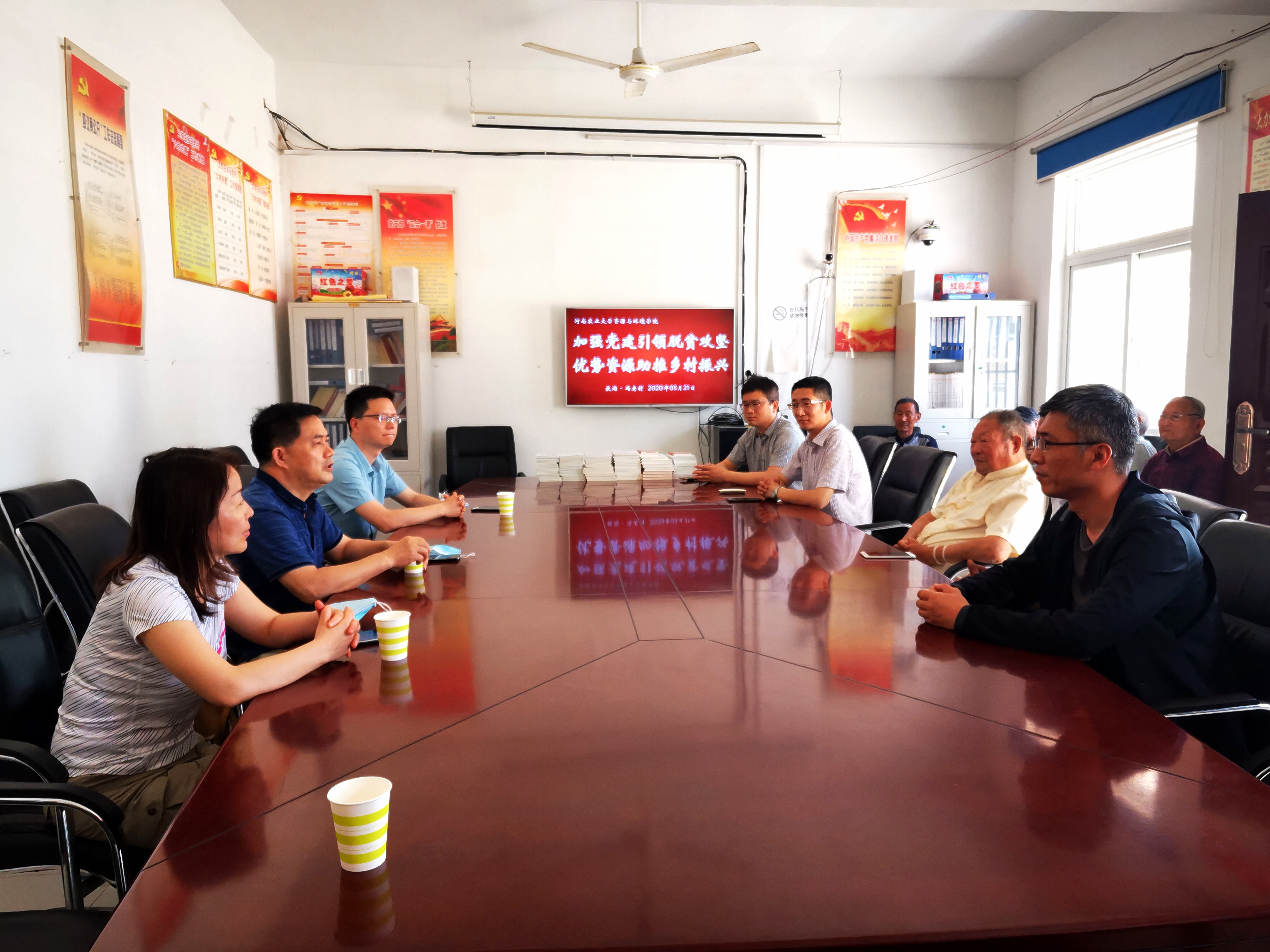 扶沟县大李庄乡冯老村是我校定点扶贫村。近几年,在我校几任驻村第一书记和当地村支部党员干部的共同努力下,该村支部党建工作开展得卓有成效,精神文明建设、村容村貌村风建设亮点突出,对脱贫攻坚工作、乡村振兴和建设工作都起到较大的助推作用。在冯老村会议室,毕庆生与 冯老村驻村第一书记宫辰、苏楠,驻村队员王永才,村支部书记、委员、党员代表等进行座谈,就基层党的建设工作进行了深入交流,并向冯老村支部捐赠党建书籍100余册,用于冯老村农家书屋建设,进一步丰富基层党建活动开展。毕庆生谈到,在通过党建促发展方面,学院在科学施肥、土壤治理、污染防治等领域可以开展生产实践技术指导和服务,发挥农业研究优势,为冯老村建设提供进一步支持,共同推动乡村振兴。
