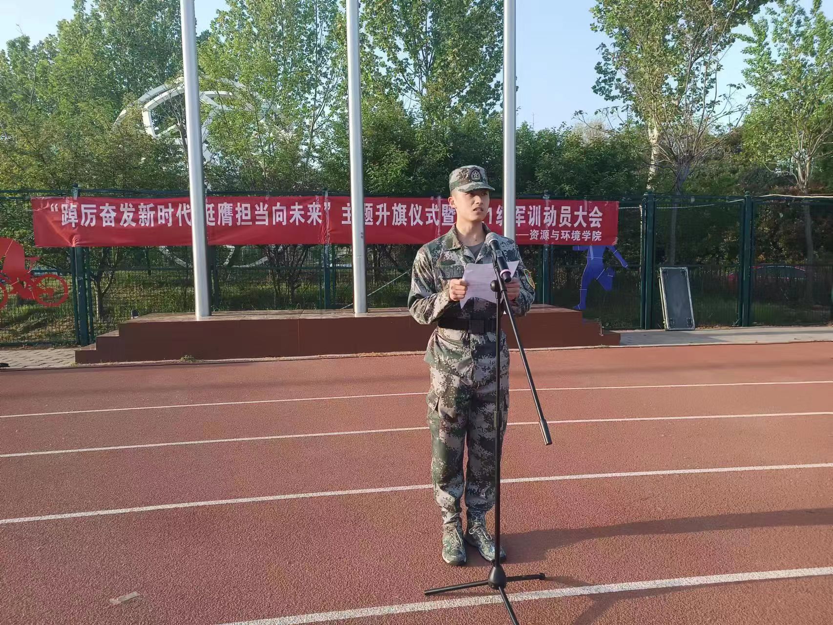 在龙子湖校区田径场举行“踔厉奋发新时代,挺膺担当向未来”主题升旗仪式暨2021级军训动员大会。大会由院长王宜伦主持。