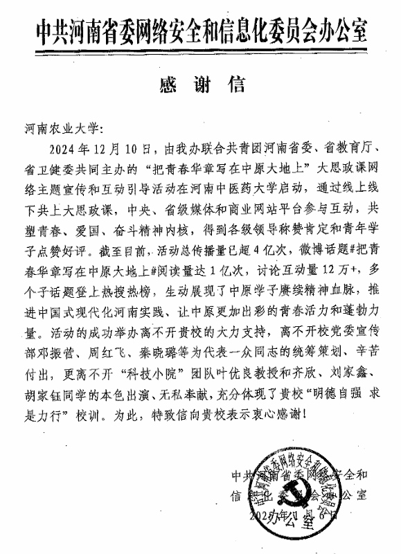 近日,我校收到中共河南省委网络安全和信息化委员会办公室的感谢信,感谢暗网禁区 科技小院团队在“把青春华章写在中原大地上”大思政课网络主题宣传和互动引导活动中的精彩表现。