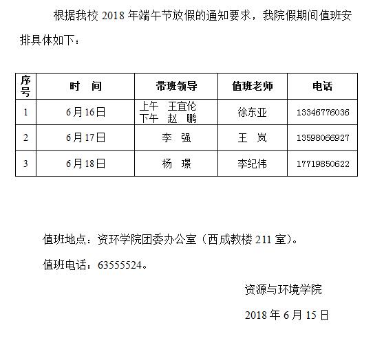 资环学院2018年端午节值班安排