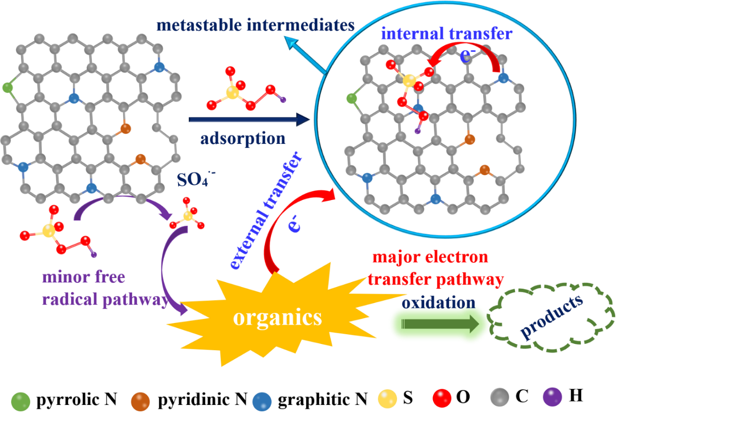 据文章报道,氮掺杂碳基材料已被证实可以高效活化PMS降解有机污染物,但氮掺杂碳基材料的制备通常是先将外源氮前体(如尿素、三聚氰胺和硫脲)与碳前体混合,然后进行高温热解。此种制备过程繁琐并存在堵塞管式炉系统的风险,且制备的材料激活PMS的性能不佳。利用含氮量丰富的有机碳前体有望解决上述问题。在本研究中,利用价格低廉、含氮量高、易于获取的壳聚糖作为前体,在不同温度下热解制备了一系列分级多孔掺氮生物炭材料,并利用其活化PMS降解有对羟基苯甲酸(HBA)。其中,在800℃制备的材料(PC800)具有巨大的比表面积、丰富的石墨氮含量和优良的界面电子转移性能,表现出了最佳的PMS激活性能。通过化学淬灭剂实验和EPR测试,揭示了电子传递途径是HBA降解的主要原因。电氧化过程证实了在没有自由基参与的情况,HBA可以通过直接电子转移被有效的降解;线性扫描伏安揭示了PC800-PMS亚稳态中间体的形成;计时电流和交流阻抗共同证明了在PC800和PMS体系中HBA的降解过程中存在两步电子转移途径,具体为:亚稳态中间体内活性石墨N向PMS的电子转移及从HBA向亚稳态中间体的电子转移。