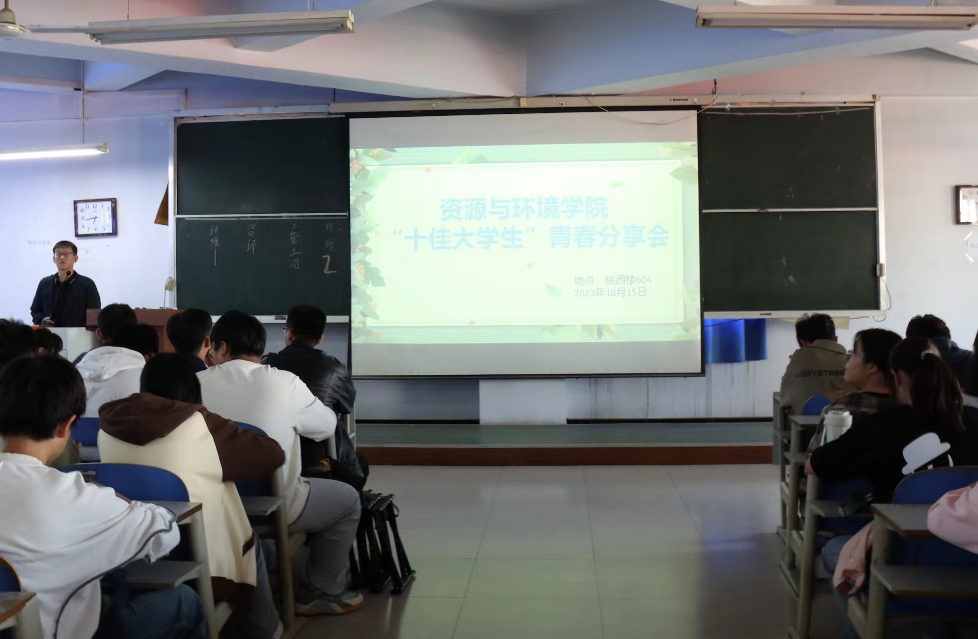 于10月15日在桃李园学生公寓桃西楼608教室举办“十佳大学生”青春分享会。2023级全体新生参加会议,由23级辅导员邓晓铮主持。