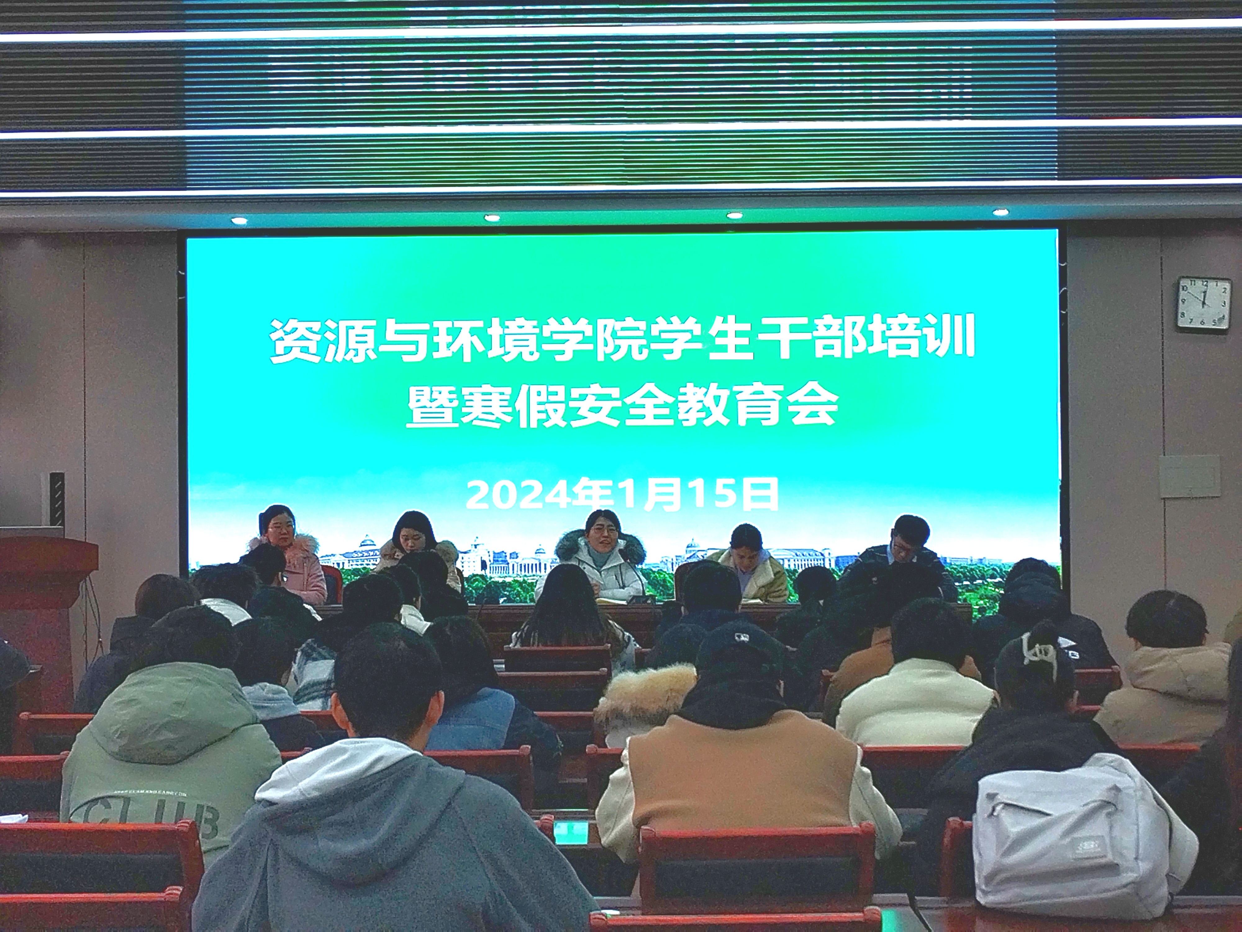 于2024年1月15日中午在力行楼338会议室召开学生干部培训暨寒假安全教育会。院团委书记王岚、团委副书记黄春萌、团委老师邓晓铮、王梦茹、郑凤君,及各年级学生干部参与会议。