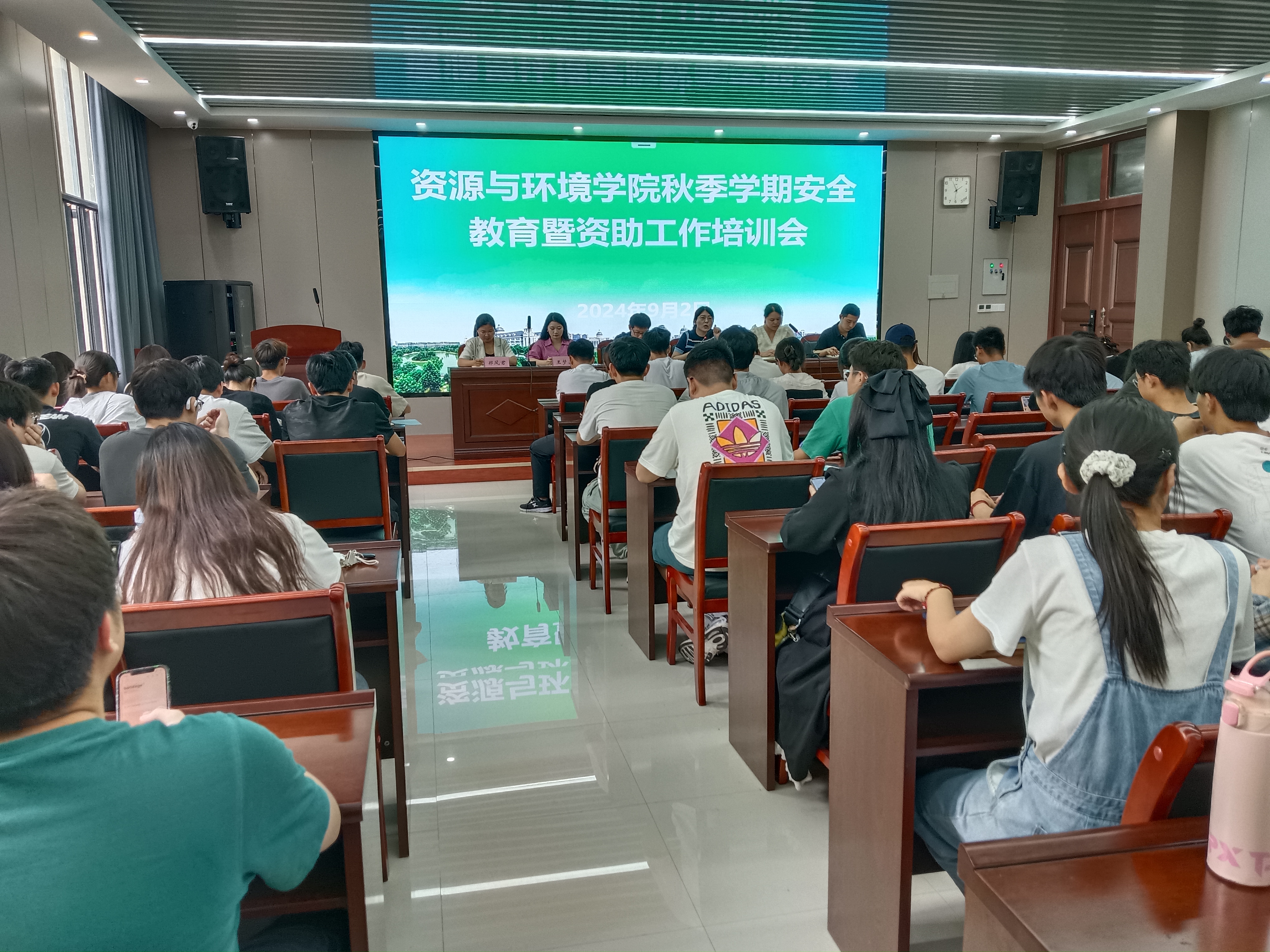于2024年9月2日在力行楼338会议室召开学生安全教育暨资助工作培训会,学院团委书记王岚,团委副书记黄春萌,团委老师邓晓铮、王梦茹、郑凤君、史新杰,各年级主要学生干部参加会议。