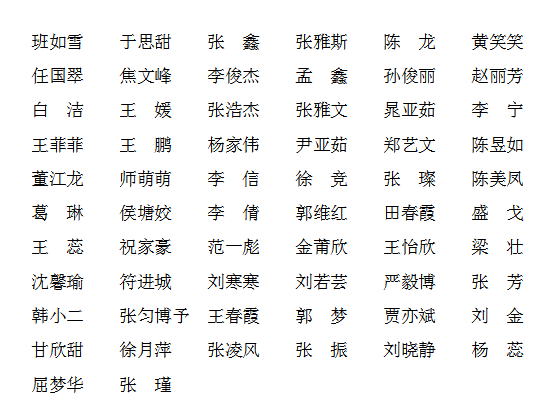 学生积极进取,奋发向上,为毕业生双向选择就业,升学创造条件。本着公平、公正、公开的原则,通过毕业生自愿报名,结合申报学生各方面综合表现,学院学生工作领导小组经研究决定班如雪、于思甜等62名同学被评为院优秀毕业生。现将名单公示如下: