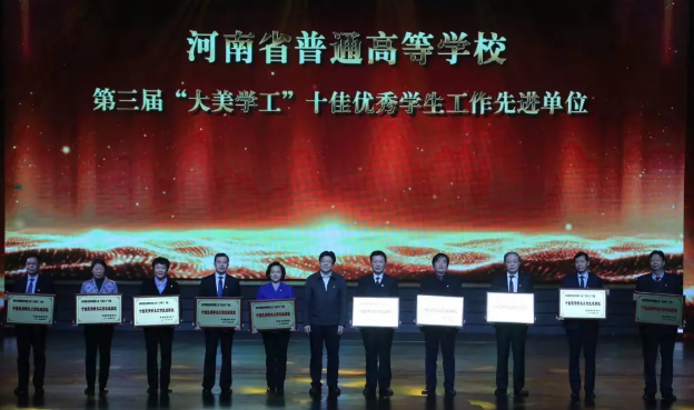 12月3日晚,河南省普通高等学校2019“大美学工”颁奖典礼暨校园文化建设优秀成果展演在新乡市平原文化艺术中心上演。省教育厅党组书记、厅长郑邦山,新乡市市长王登喜,省教育厅副巡视员吕冰等出席颁奖典礼。各普通高校分管学生工作的校领导、学生处处长及学生工作者代表参加颁奖典礼。我校副校长尹新明及学生工作部(处)有关同志、各学院辅导员代表参加典礼。