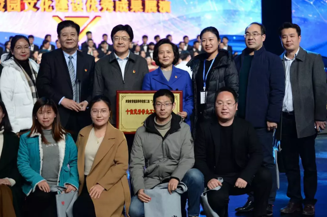 典礼上,副校长尹新明,学工部部长、学生处处长李书民分别上台领取十佳优秀学生工作先进单位奖牌和校园文化建设优秀成果一等奖奖杯。