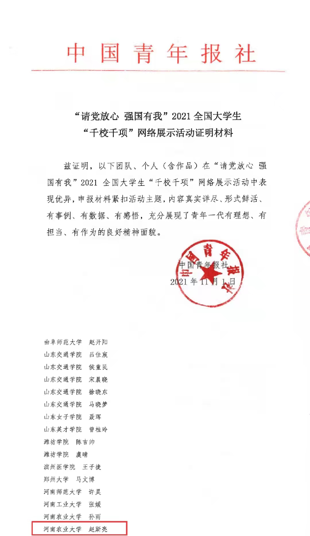 2019级环境生态工程专业学生赵斯亮脱颖而出,成功上榜“千校千项”个人事迹名单!