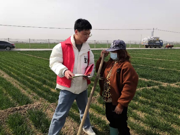 下午,杨街科技小院还开展了“农业技术送地头”活动,学生党员深入田间地头,调研当前农业管理情况,对有技术需求的农户进行一对一志愿服务,在拉近党员与群众间距离的同时,进一步将所学知识融入生产实践。