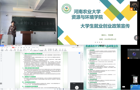 主题班会从就业、创业两个不同视角出发,通过就业政策解读和形势分析切实为每一位毕业生提供帮助。各班结合实际情况开展线上或线下主题班会,集中学习教育部及河南省就业创业政策。部分班级邀请班主任和辅导员一对一解答同学们对于就业创业政策的疑惑,进而引导同学们全面客观看待当前就业形势,鼓励大家多方面、多角度、多渠道就业创业。