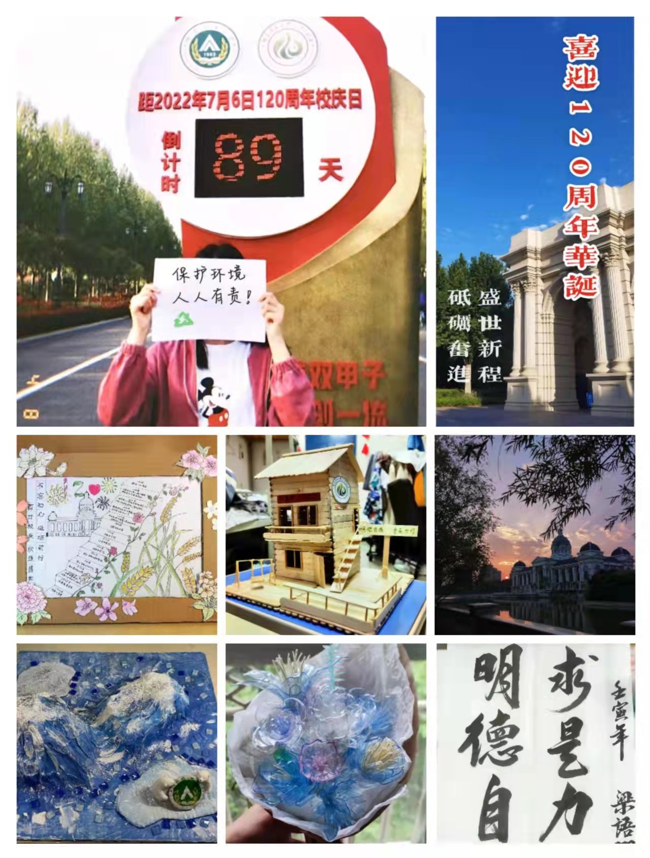 本次活动共包含作品征集和初选、线上展示和投票、结果公示和颁奖等主要环节。征集作品环节,学生们踊跃参与,或个人制作或与室友、班级成员等共同完成;在制作过程中,注重融入所学专业特点和生态环保理念。书法、绘画、摄影以及手工品等各类作品,不仅寄寓着学生对百廿校庆的美好祝福和期盼,展现了大家的创新意识和动手能力,也彰显了年轻一代的青春活力与风采。尤其是环保T台秀,衣服由各类废弃材料制成,舞台造型由学生们自主设计完成,反映了资环学子的创造活力和无畏风姿,获得学院师生的一致好评。