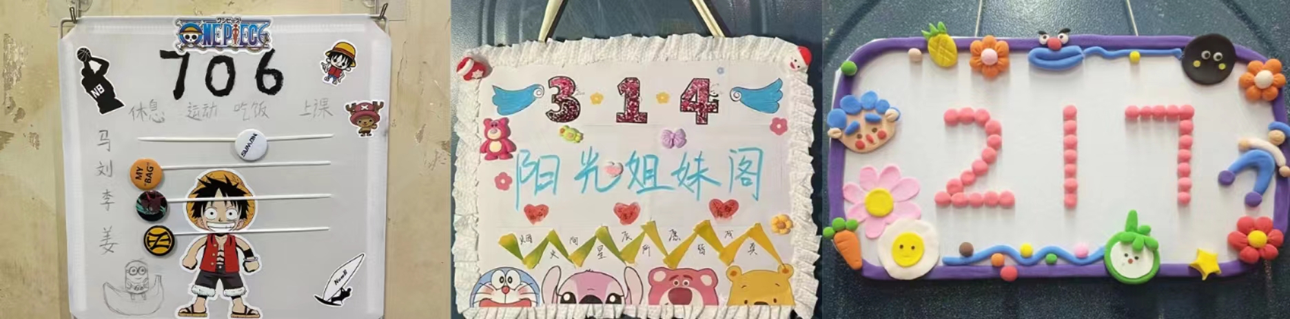各新生宿舍充分利用身边的制作材料,本着“空间有限,创意无限”的理念,认真设计、精心制作自己的宿舍门牌。有的寝室将插花艺术融入寝室门牌,典雅大气;有的寝室将动漫人物粘贴在门牌上,俏皮可爱;有的寝室动手DIY,将色彩缤纷的小广告变废为宝,制作了独一无二的门牌……小空间体现大智慧,不同的设计使得宿舍风格各具特色,充满了生活气息。