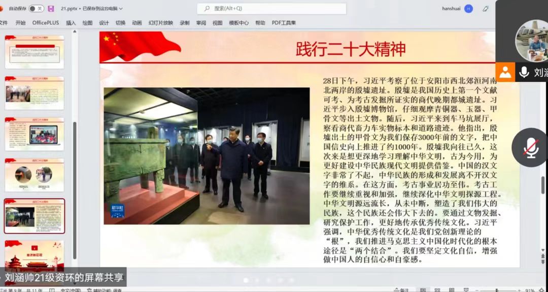 期间,各团支部结合实际情况以多种形式开展本次活动。通过重温党的二十大开幕会盛况,再次认真聆听党的二十大报告,深入了解党和国家事业取得的历史性成就、历史性变革,深刻认识党的二十大在党和国家发展进程中的重大意义。通过举办党的二十大精神宣讲会、学习交流会等,进一步引导学生深刻理解党的二十大精神,进而凝聚共识、汇聚力量,筑牢青年学子的信仰之基。还通过录制相关视频,以青年人喜闻乐见的语言和方式进行宣传,进一步引领青年团员把思想和行动统一到党的二十大精神上来,增强作为担当民族复兴大任的时代新人的决心。